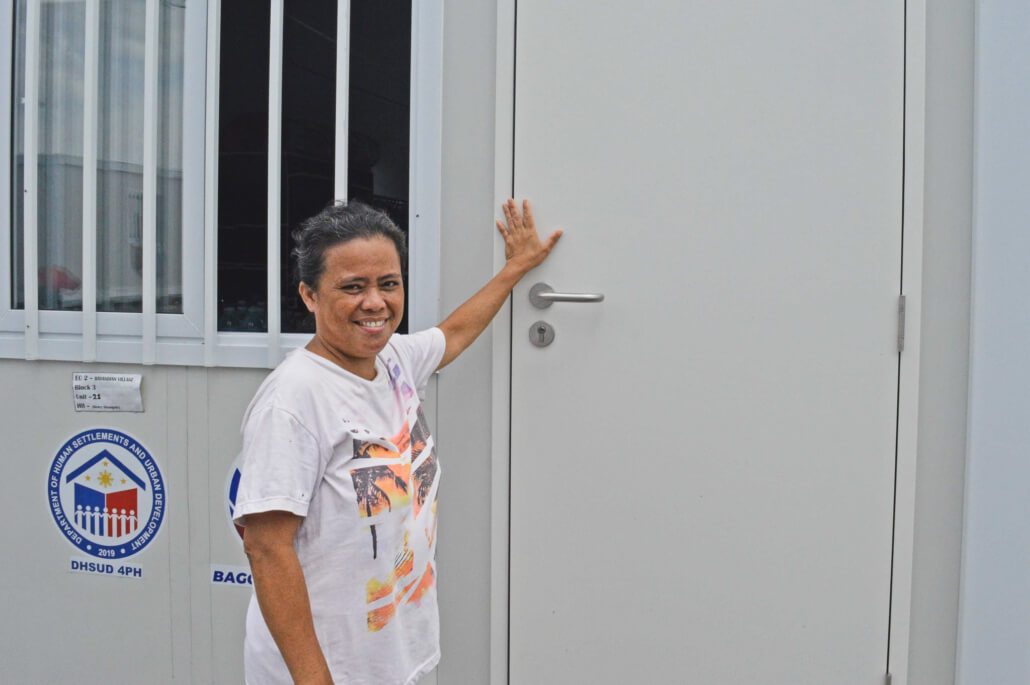 In photo: Tessie stand outside the temporary smart home provided by the government. The smart home is where they will live for at most a year since their home was totally damaged by the magnitude 6.9 earthquake last September 30, 2025. (Photo by Joyce Sandajan for Action Against Hunger)