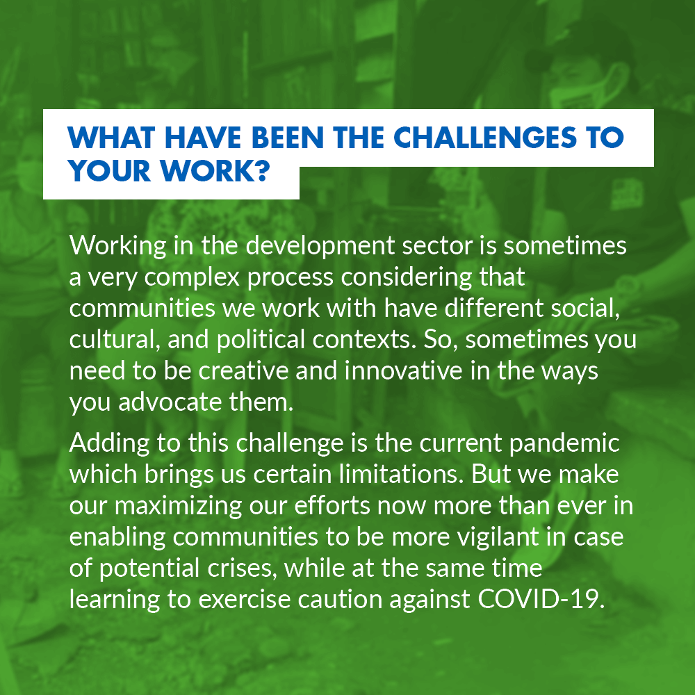 “Naiintindihan ko kasi ang hangarin at adbokasiya ng Urban Resilience lalo na sa usapin ng pagse-savings. Gusto ko maging involved sa paghahanda ng community kapag may dumating man na sakuna.”