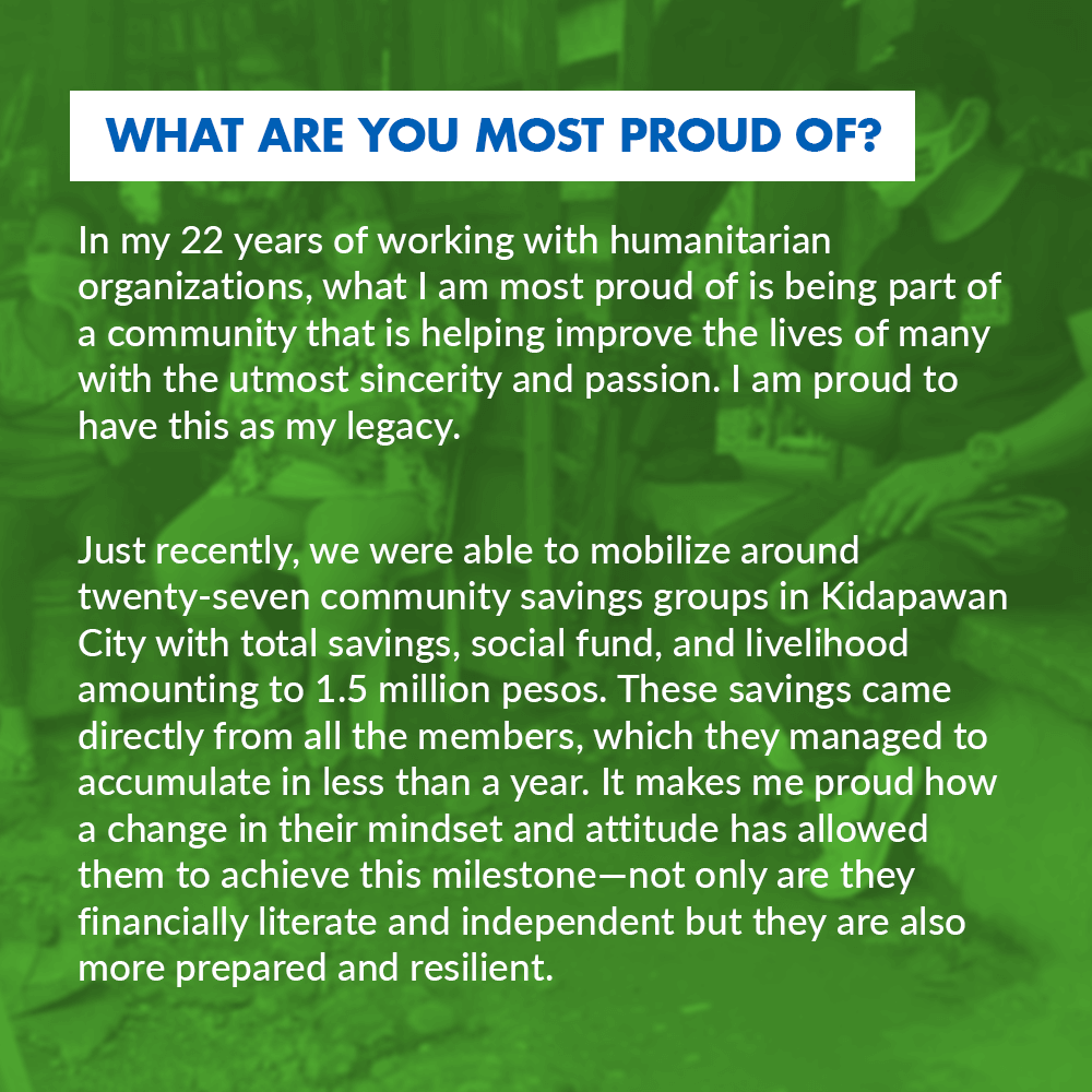 “Na dati nagsimula lang kami sa Agoho Community Savings Group. Ngayon, isa na kaming federation sa Kidapawan. Magpaparegister na din kami sa DOLE at SEC sa tulong ng Action Against Hunger at Public Employment Service Office ng LGU Kidapawan.”